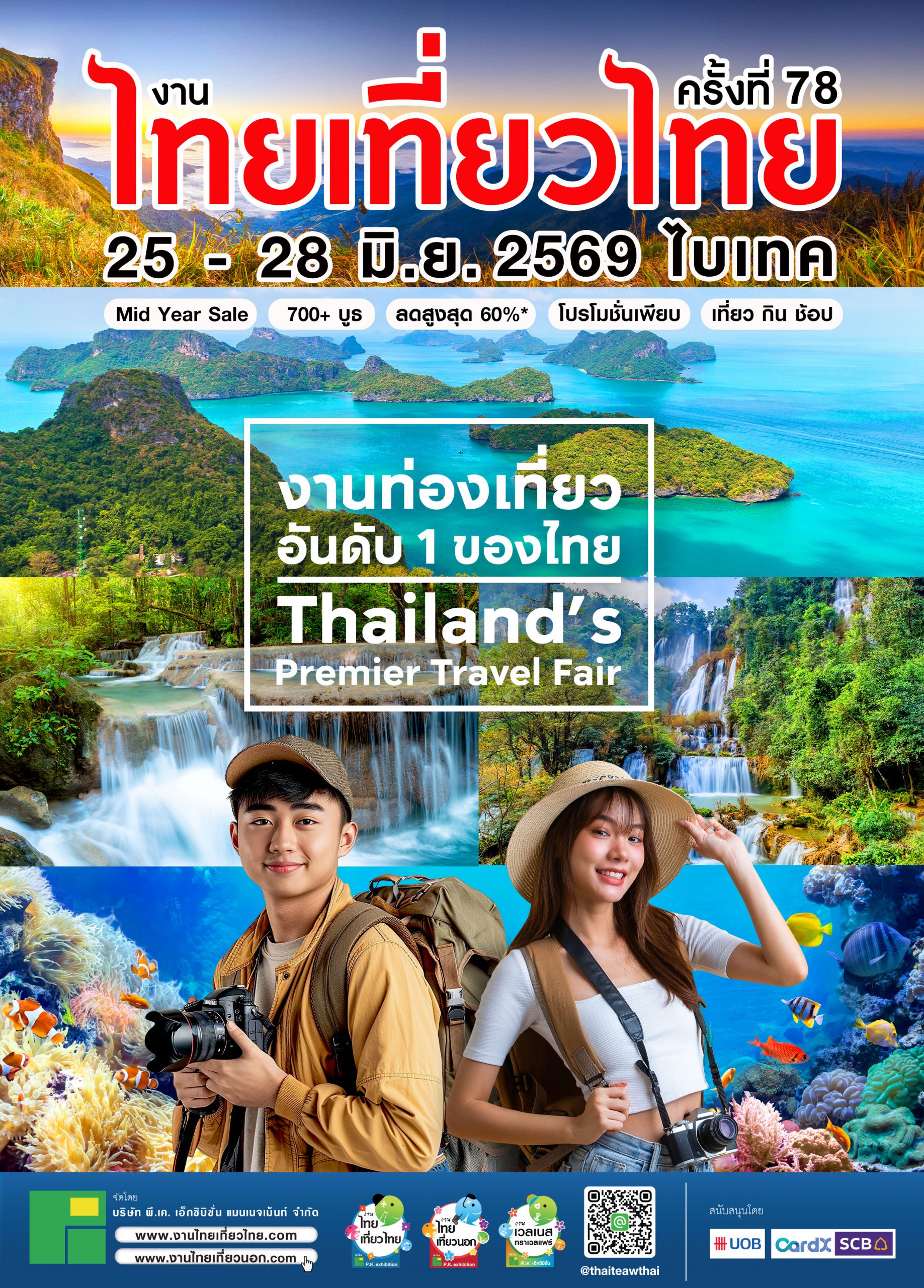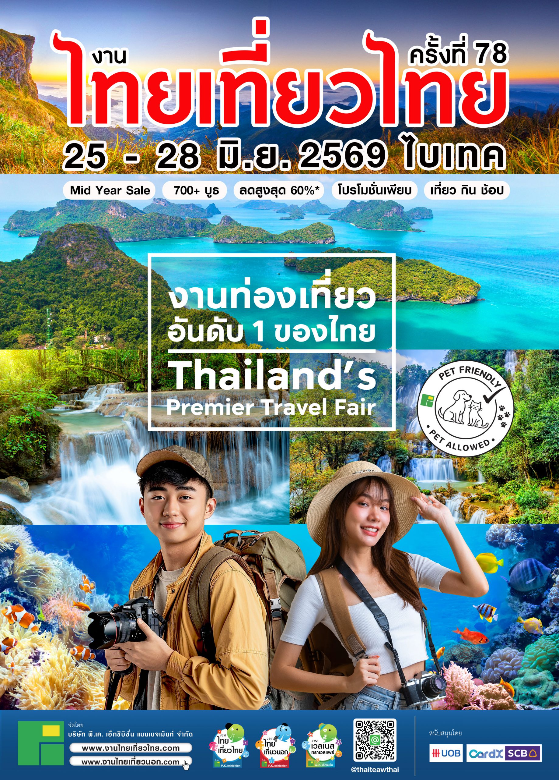 เตรียมพบกับมหกรรมท่องเที่ยวครั้งยิ่งใหญ่กลางปี กับงานไทยเที่ยวไทย ครั้งที่ 78 แพ็คเกจเที่ยวหน้าฝนกว่า 700 บูธ จากโรงแรม รีสอร์ท ทัวร์ รถเช่า สายการบิน สปา เรือสำราญ สถานพักผ่อนหย่อนใจ ฯลฯ ครบครันด้วยโปรโมชั่นลดราคาพิเศษเฉพาะที่งานนี้เท่านั้น !!! พบกัน 25-28 มิ.ย. 2569 เวลา 10.00 – 21.00 น. ณ ไบเทค ฮอลล์ 103-104 เข้าชมงานฟรี!