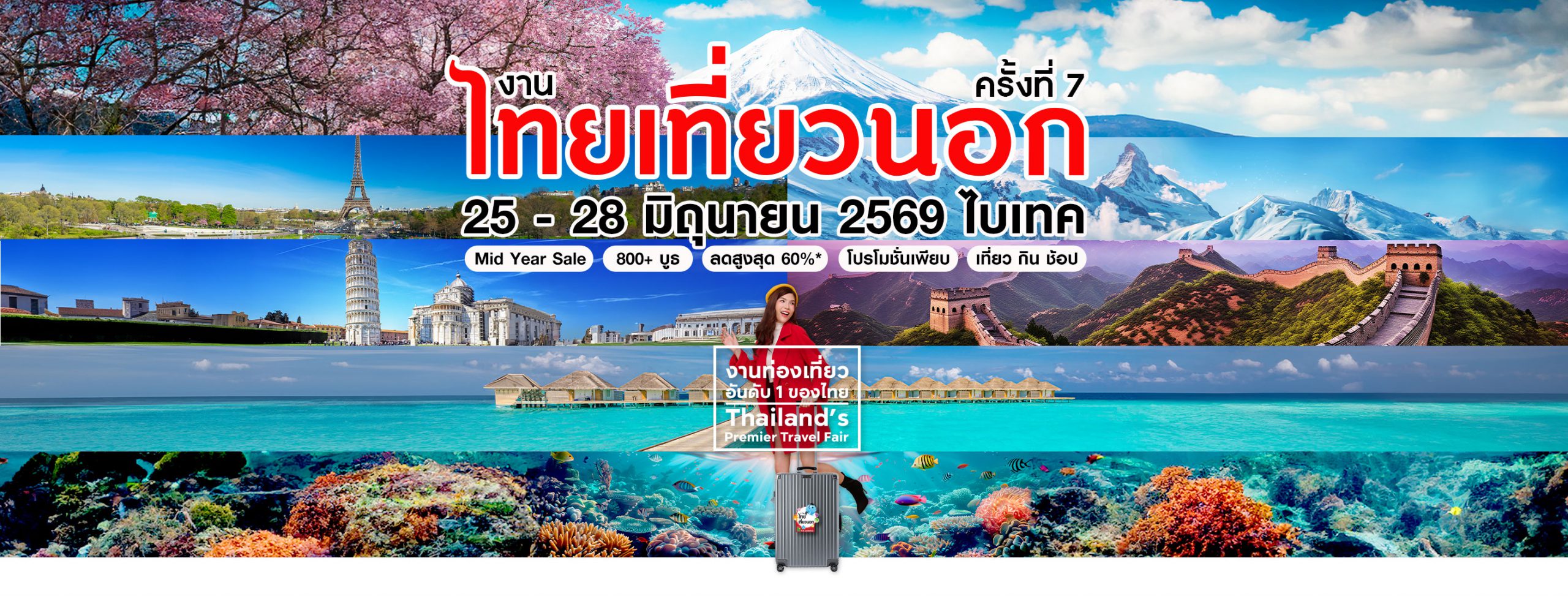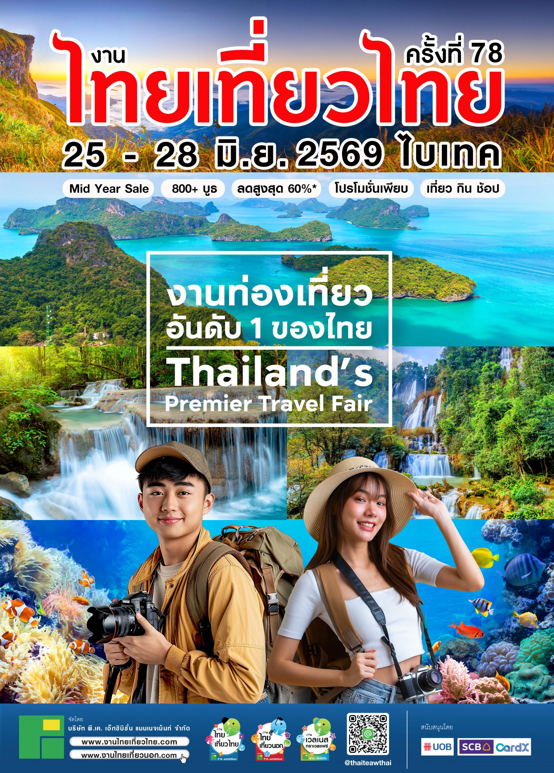 เตรียมพบกับมหกรรมท่องเที่ยวครั้งยิ่งใหญ่แห่งปี 2569 กับงานไทยเที่ยวไทย ครั้งที่ 78 แพ็คเกจเที่ยวจากโรงแรม รีสอร์ท ทัวร์ รถเช่า สายการบิน สปา เรือสำราญ สถานพักผ่อนหย่อนใจ ฯลฯ ครบครันด้วยโปรโมชั่นลดราคาพิเศษเฉพาะที่งานนี้เท่านั้น !!! พบกัน 25 – 28 มิถุนายน 2569 เวลา 10.00 – 21.00 น. ณ ไบเทค เข้าชมงานฟรี!