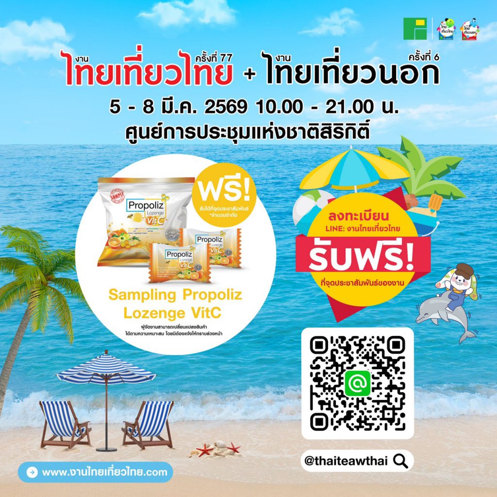มางานไทยเที่ยวไทย ครั้งที่ 77 ระหว่าง 5 – 8 มี.ค. นี้ ณ ศูนย์การประชุมแห่งชาติสิริกิติ์ ลงทะเบียนเข้าชมงานผ่าน LINE @thaiteawthai รับฟรี! ขนม Propoliz Lozenge VitC ที่จุดประชาสัมพันธ์ *